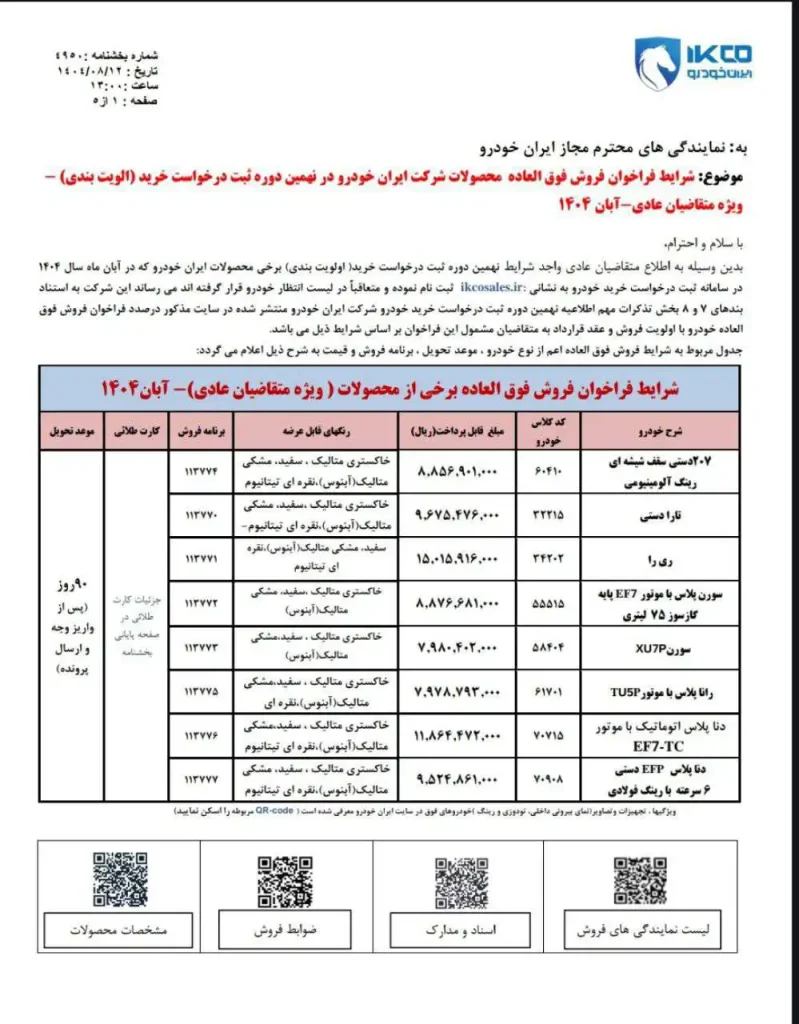به گزارش بخش خبری گلدیکا، شرکت ایران خودرو بخشنامه جدید خود را در خصوص فروش فوری، پیشفروش و فروش فوقالعاده محصولاتش ویژه برندگان نهمین دوره طرح عادی ثبت نام اعلام کرد. این بخشنامه مختص افرادی است که در قرعهکشی آبان ۱۴۰۴ منتخب شدهاند و امکان خرید خودروهای مختلف از جمله «ری را»، «تارا»، «پژو ۲۰۷» و سایر مدلها را در قالب فروش فوری، فروش فوقالعاده و پیشفروش فراهم میکند.